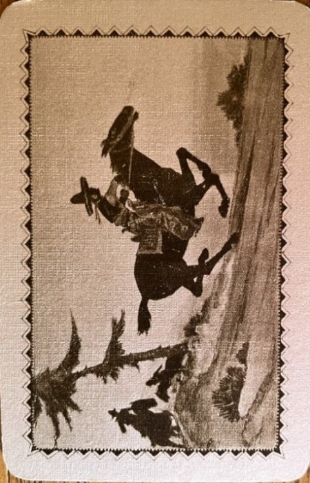 This is a John Waddington LTD deck. Name unknown - Cowboys is of my choosing. It almost certainly belongs to the same Waddington for Wills series as the Camel deck shown at 491 here (and in the Gallery)