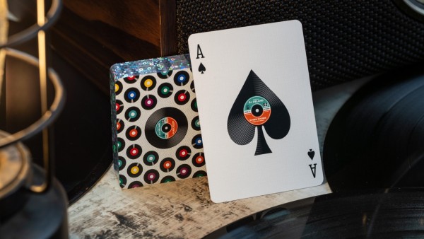 The card backs have a full-bleed borderless design, covered in dozens of vinyl records. Utilizing a "clock-and-color" marking system devised by Kevin Reylek, you'll be able to discern both the suit & value of any card in the deck just by glancing at the back. Because of the size of the marks and the color-based suit system, the deck can be read from quite a reasonable distance!