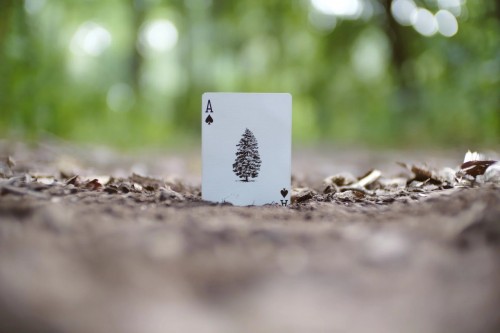 Full-bleed American Pine grain, borderless edge to edge. 52 cards, 2 jokers, 1 double-backer, 1 blank face.