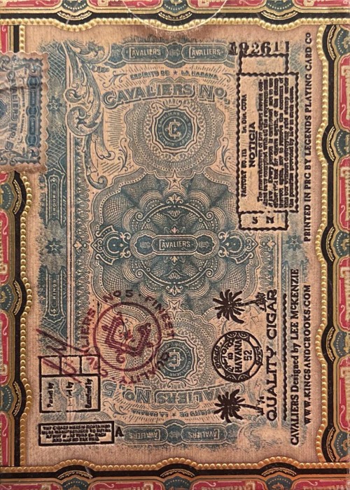 EXPORT 1800 - The standard Cavaliers sent back through time, transforming it into an authentic, old Cuban style cigar box and one incredibly unique collectors item. The box itself mimics a cigar box, complete with an extra flap on the front side kept closed with embedded magnet as well as sealed with custom numbered seal. Tear the seal and open the flap to reveal 8 Cuban cigars! Although the box can be opened like a standard deck to get the cards. The design is inspired by the iconic Havana export warranty stamp seals exclusively issued only to official Cuban cigars. The paper appeared to have aged, as well as stamps and seals can be found anywhere.