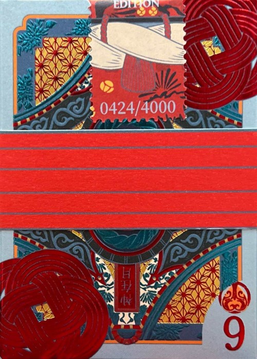 The tuck box is a double-layer construct. The sleeve is a black matte stock with a precision laser-cut graphic of the catchphrase "DON'T PANIC" on the front and an related item of the story on the back. There are 6 different variants, based on the color of the box as well as the icon on the back of the sleeve. The main box is made of matte stock with two different holographic hot foil (mainly silver, with gold on the spaceship and some small details). The interior of the box has a graphic art done in holographic foil.