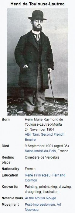 Physically unable to participate in many activities enjoyed by boys his age, Toulouse-Lautrec immersed himself in art. He became an important Post-Impressionist painter, art nouveau illustrator and lithographer. Through his works, he recorded many details of the late-19th-century bohemian lifestyle in Paris.