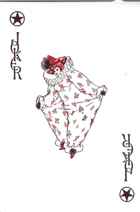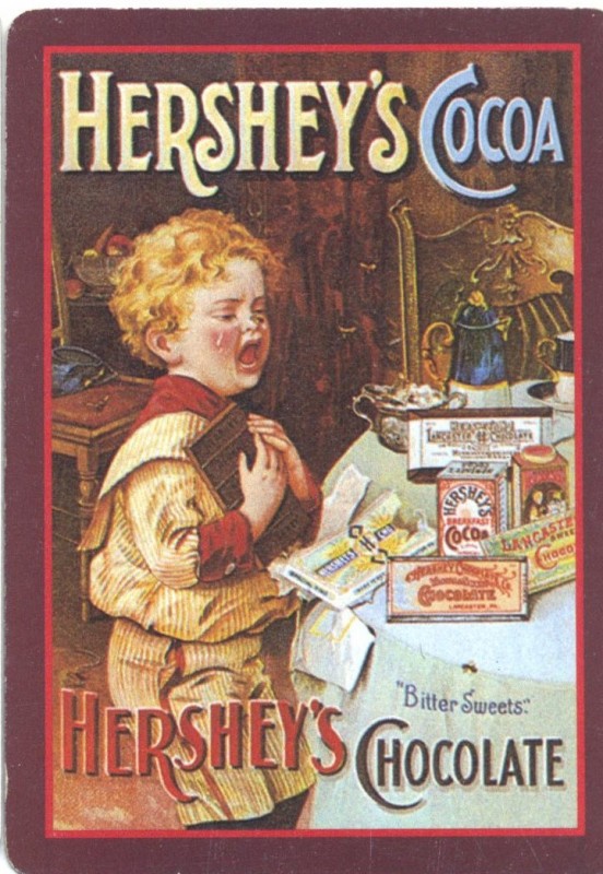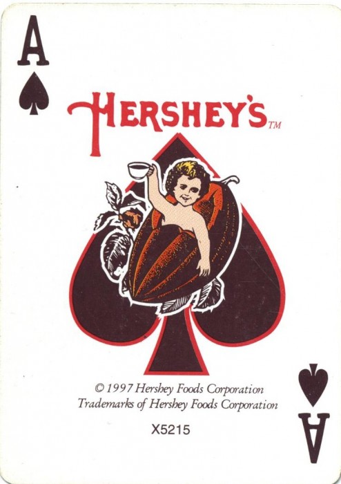 This Hershey's Chocolate / Hershey's Cocoa deck was published in 1997. Instead of black ink for the clubs and spades, a dark chocolate brown is used. Printed by USPCC, the deck uses the joker design usually associated with the Aristocrat line.
