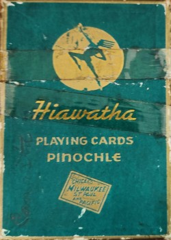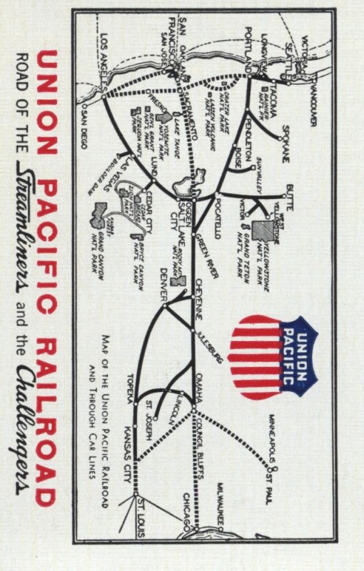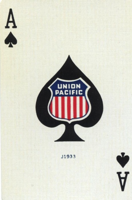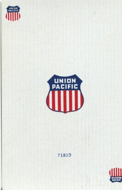 The Union Pacific "Road of the Streamliners" features a photo of Jackson Lake and the Teton Mountains on the card back. The joker and spade ace feature the Union Pacific shield logo, and the extra joker is a UP route map from Chicago to San Francisco east to west, San Diego to Vancouver south to north. Printed by USPCC.