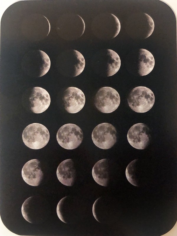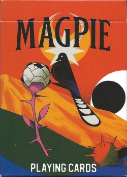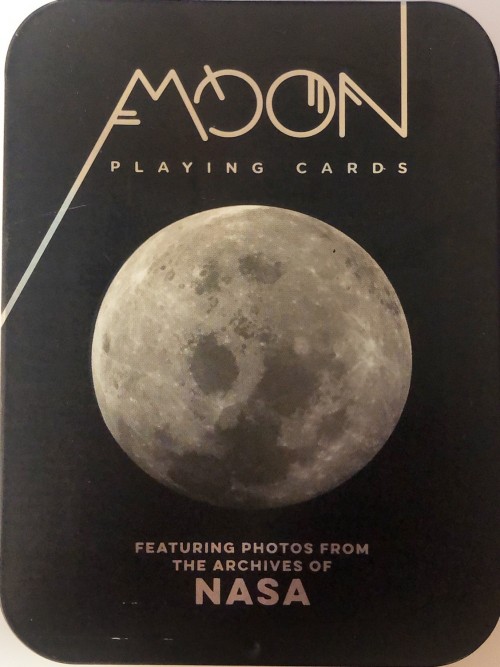 The box for this deck is a tin box with a sliding lid, covered by a die-cut cardboard sleeve. The 'front' and back' images show the box with the sleeve. I have included below a photo of the front of the box without the sleeve. The back of the box beneath the sleeve is matte black. I have also included a photo below of the backs of the cards, which shows photos of the phases of the moon. The deck includes ten photos of the moon in progressive phases on cards ace through ten, repeated in all four suits. The court cards show full colour photos of spacecraft, again repeated in all four suits. The jokers are identical and show a photo of 'Ranger 7.' The indices are custom.