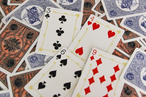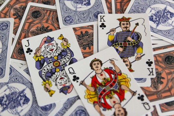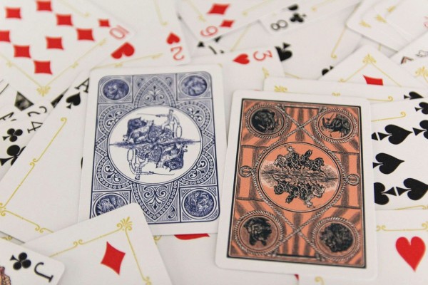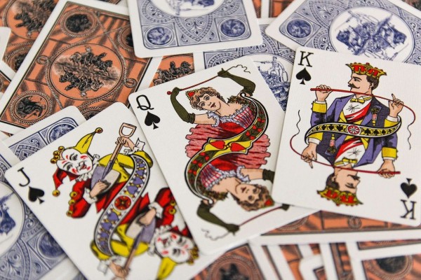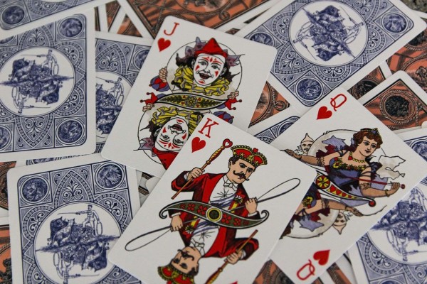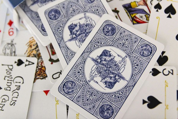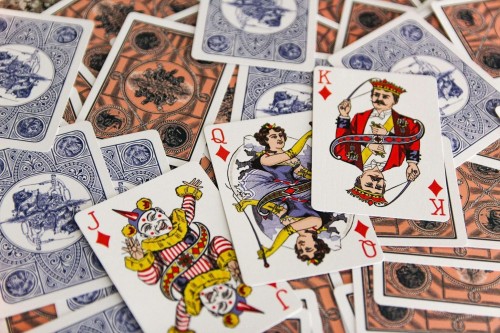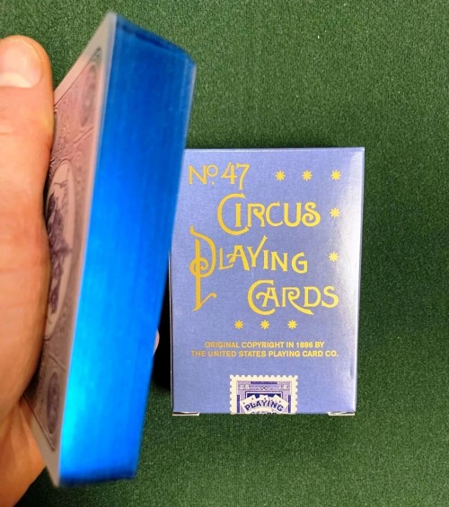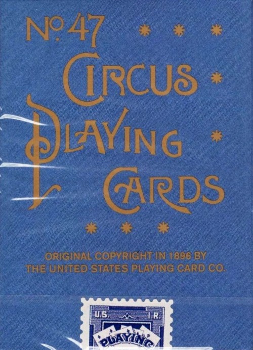 Gilded version of: First printed in 1896. The original No. 47 Circus Playing Cards advertising copy said: “The staid old Kings, Queens and Jacks have given way to various well-known ring masters, clowns and queens.” This fun all purpose deck features easy to read large indices and 12 interesting individual courts. The original deck only included 1 joker but we added an extra for modern game play. The blue color deck has a 2-way back design featuring a lion tamer and a lion and a horse in the corners.