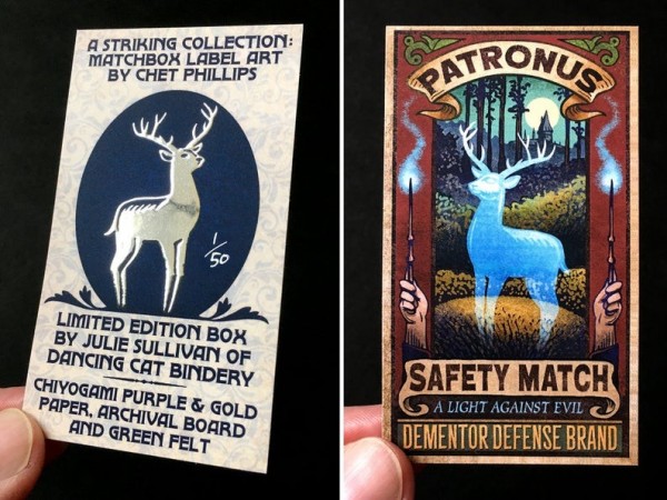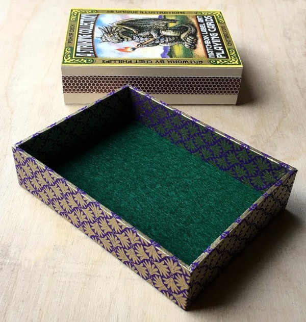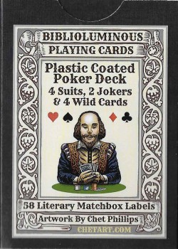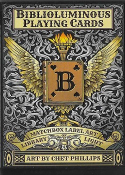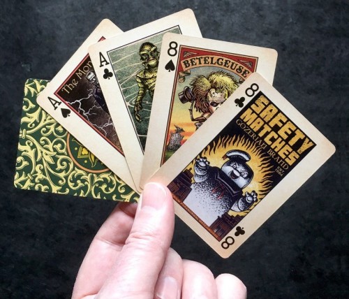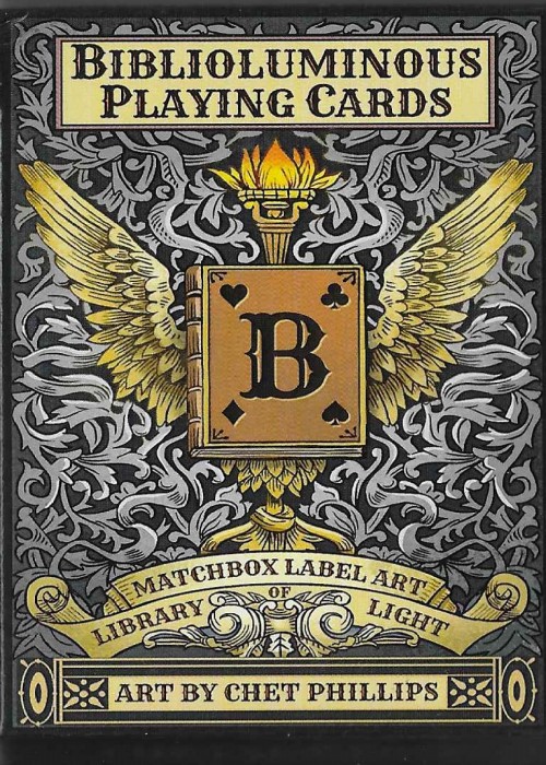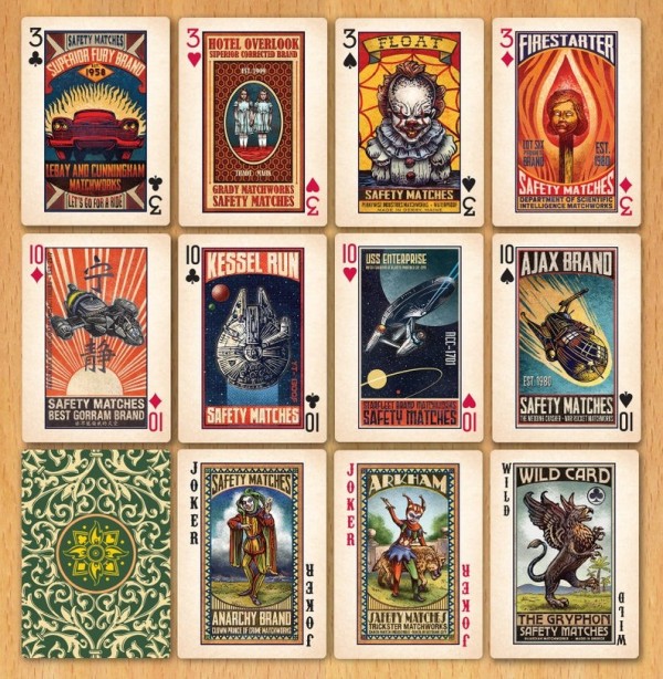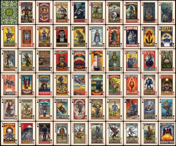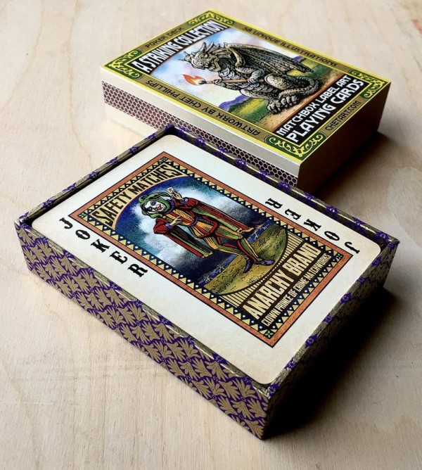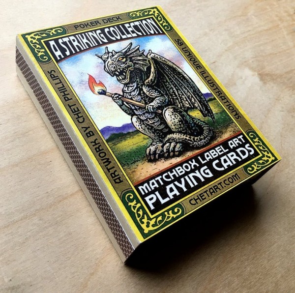 A Striking Collection: Matchbox Label Art Playing Cards. Deck includes 58 individual matchbox label playing cards illustrated by Chet Phillips. High quality, plastic coated standard poker sized deck of cards. Custom back design, 2 Jokers and 4 Wild Cards. Suits represent a variety of characters and objects from pop culture, books, TV and movies emulating vintage matchbox label ephemera. Each deck is sealed in cellophane wrapping and presented in a colorful heavy card stock custom box. Full Deck Scan: https://cardscans.piwigo.com/index?/category/174-a_striking_collection.