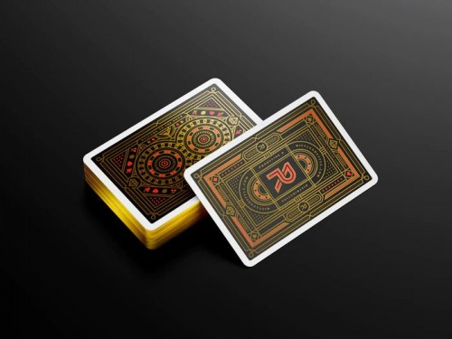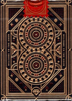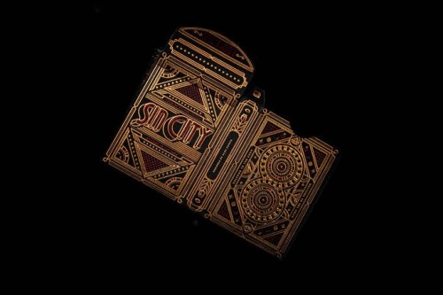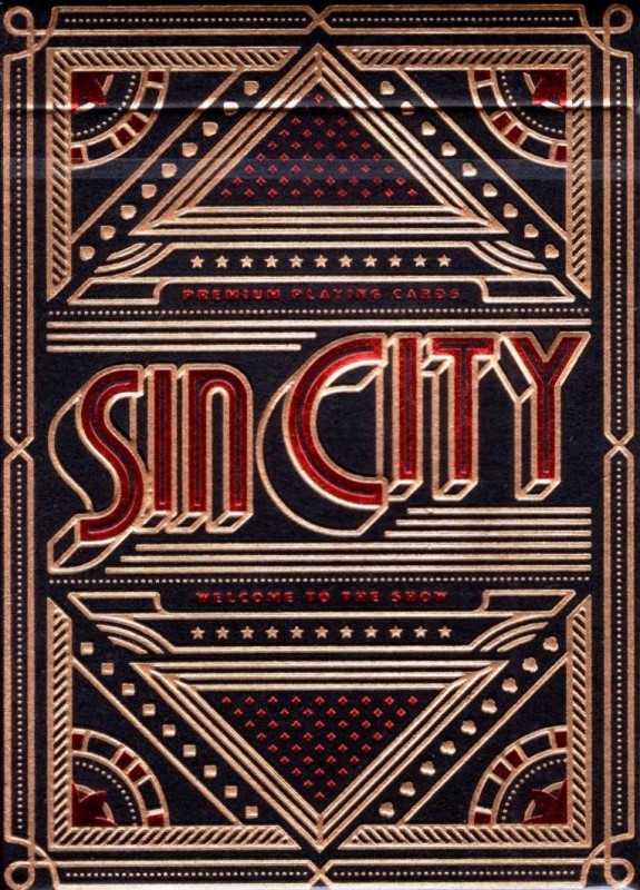 The front of the box features large red letters saying “Sin City” placed in the middle of a golden diamond, while the back and the sides are completely covered in a symmetrical design, which is repeated throughout the whole deck.
