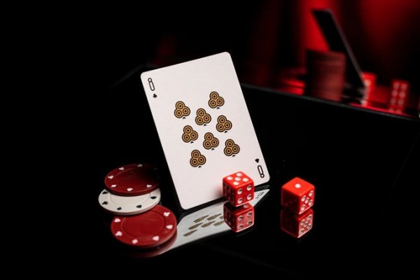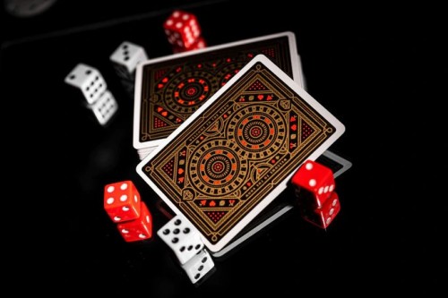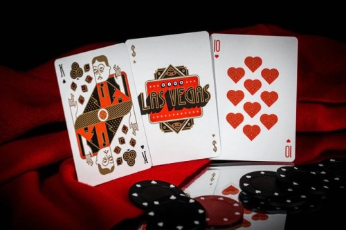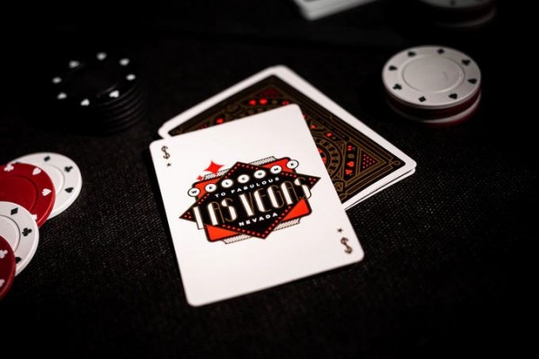 Following the design of the box, the backs of the cards boast a red-and-gold pattern similar to the one from the top of the box, made up of two adjoining roulette wheels lined by diamonds, martini glasses, and other quintessential Las Vegas elements.