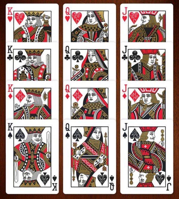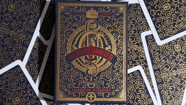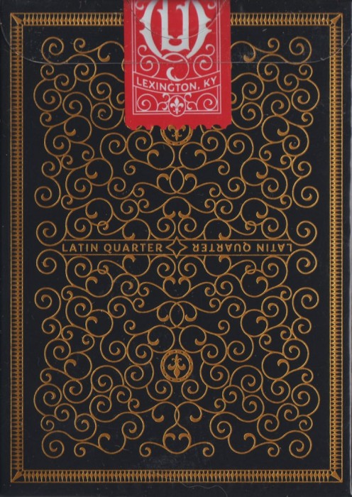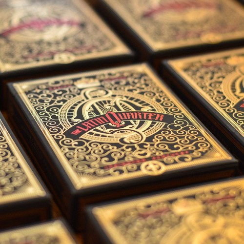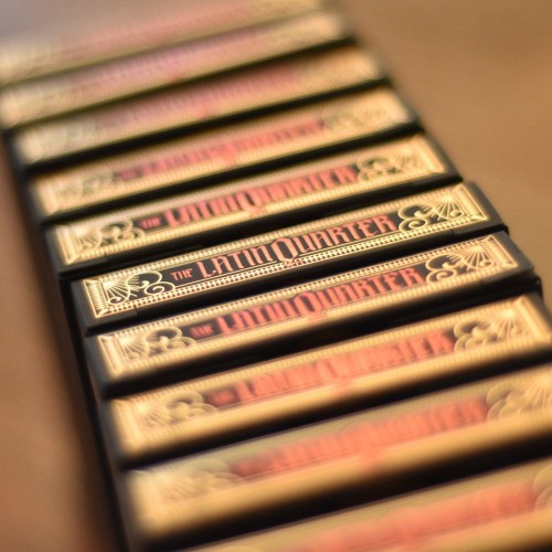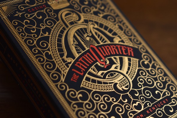 The "Latin Quarter" moniker harkens back to Paris in the Middle Ages. The Latin Quarter was the area around the great University of Paris where all the scholars and great thinkers of the time resided and Latin was the commonly spoken tongue in the area. Our design pays homage to that history. The typeface used for the Latin Quarter logo is a blackletter font based on the dense calligraphic scripts that monks in the Latin Quarter would have used to write manuscripts. The Fleur De Lis is the historic symbol of the French monarchy and it makes appearances throughout the deck.