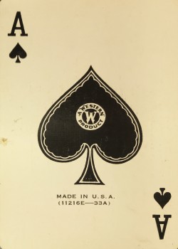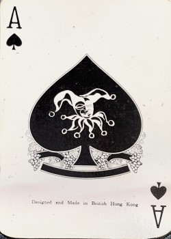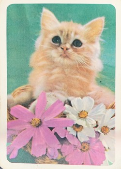 Standard bridge-sized deck of cards with a stylised large-headed girl holding a large daisy bigger than her head, standing amongst proportional daisies on a turquoise background. The style would suggest the 1960s or 1970s, although there is no date. The box contains no title. They are Duratone plastic cards from Aarco in a metallic gold and fuzzy-flocked box. The backs are one-way as in the photo of the box. The jokers are different with one in black and white, the other the same picture with some red and yellow.
