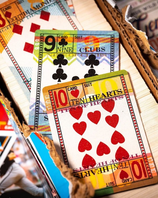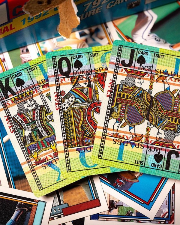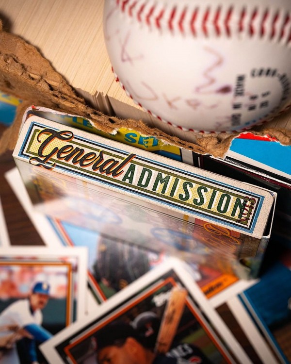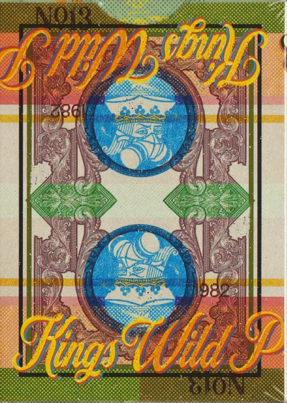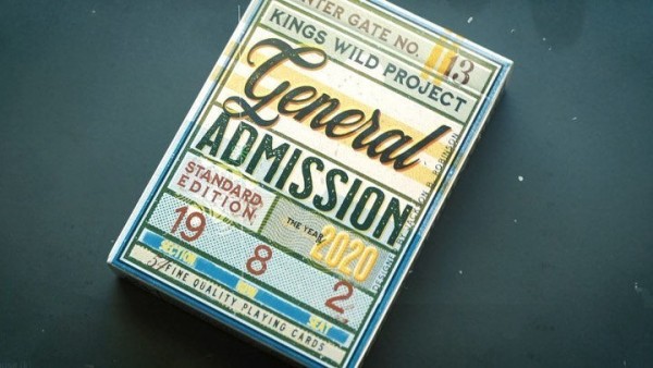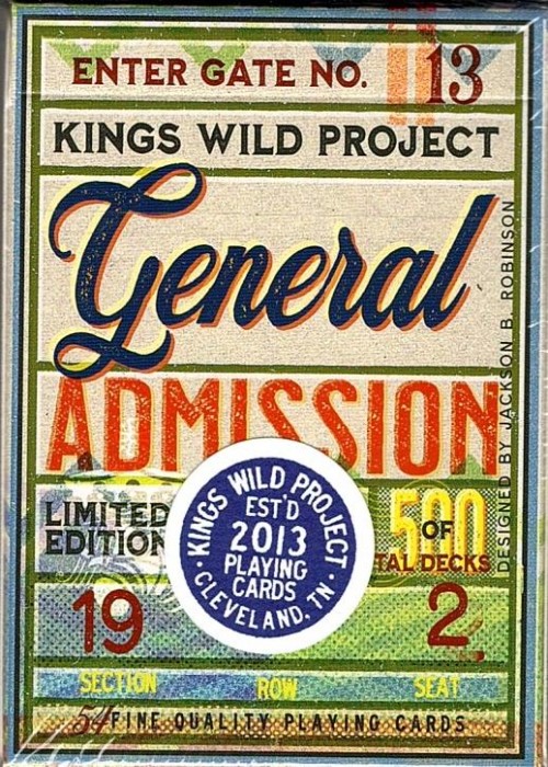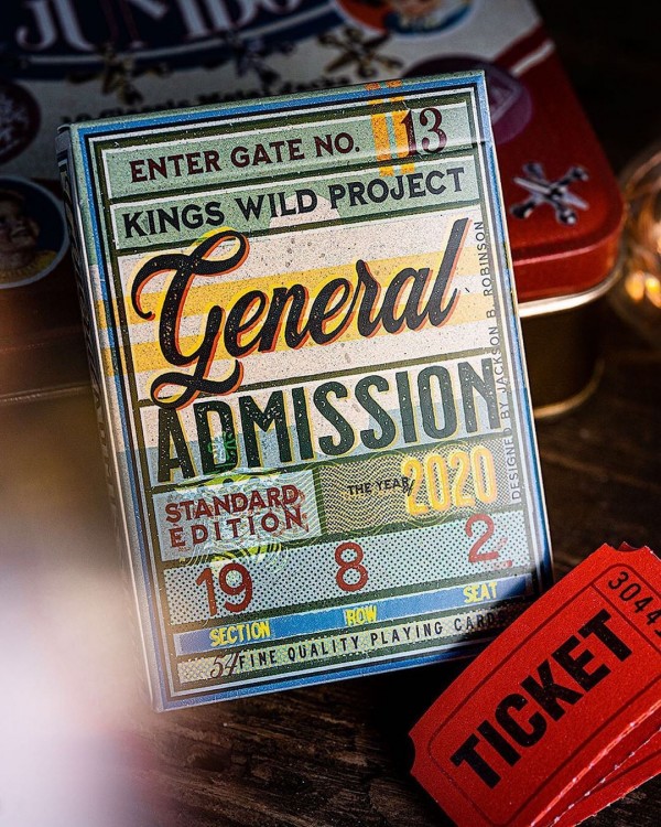 General Admission was the Kings Wild Shorts Subscription deck for May, 2020. The design inspiration for this unique deck came from Jackson's draw towards vintage ticket stubs from the early 20th century. Printed by EPCC, the semi-gloss tuck case resembles the layout of a ticket stub, including the gate number, section, row, and seat, which hide an Easter Egg for those who follow Jackson's design themes closely. The complex back design plays along the same lines, adding design elements resembling some of Kings Wild's currency decks, along with the iconic logo. As you open the deck, you'll find the familiar Kings Wild motto, "Work with your hands. Mind your own business." Inside, the cards take this deck to the next level of vintage nostalgia, with heavy amounts of texture, a wide range of vibrant and visually interesting patterns, and bold design elements. The court cards feature mirrored, full-body characters - a first for designer, Jackson Robinson. Get your tickets! Full Deck Scan: https://cardscans.piwigo.com/index?/category/354-general_admissinoCOMPANY:Kings Wild Project