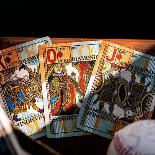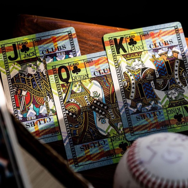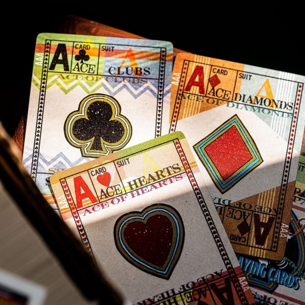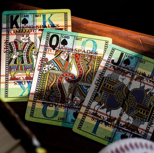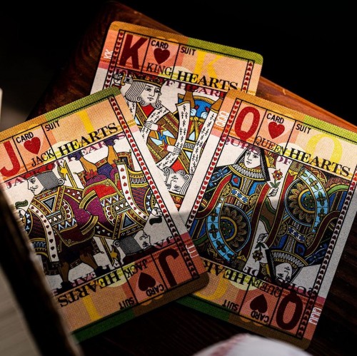 Inside, the cards take this deck to the next level of vintage nostalgia, with heavy amounts of texture, a wide range of vibrant and visually interesting patterns, and bold design elements. The court cards feature mirrored, full-body characters - a first for designer, Jackson Robinson.