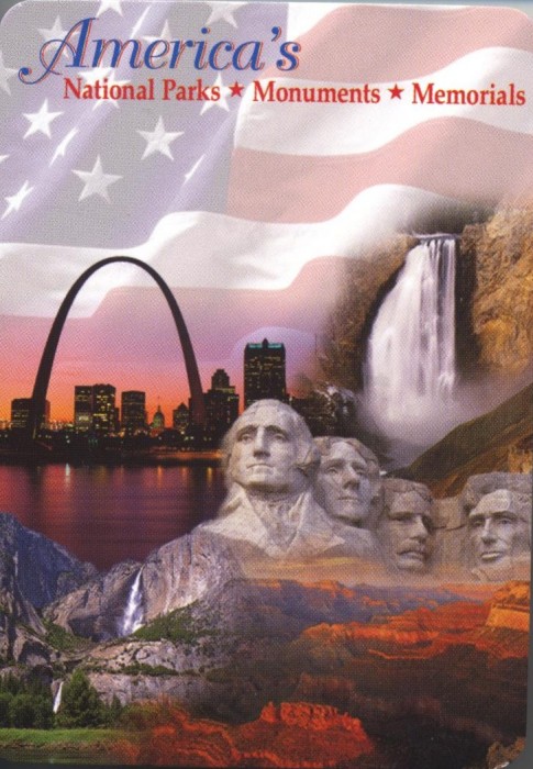 Impact Photographics has produced several decks for individual U.S. National Park Service sites; this is the deck that covers many American parks, monuments and memorials. Each card has a different location and photograph. No publication year on box.