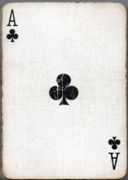 Vintage bridge-sized deck with gilt backs, in a slipcase tuck box. The jokers are identical, showing Harlequin with suit symbols in the white squares of his costume, and holding a sword spearing the suit symbols. The backs are one-way and borderless. The gilt has worn over time and some has transferred to the edges of the cards.