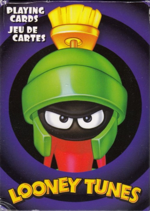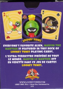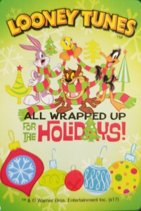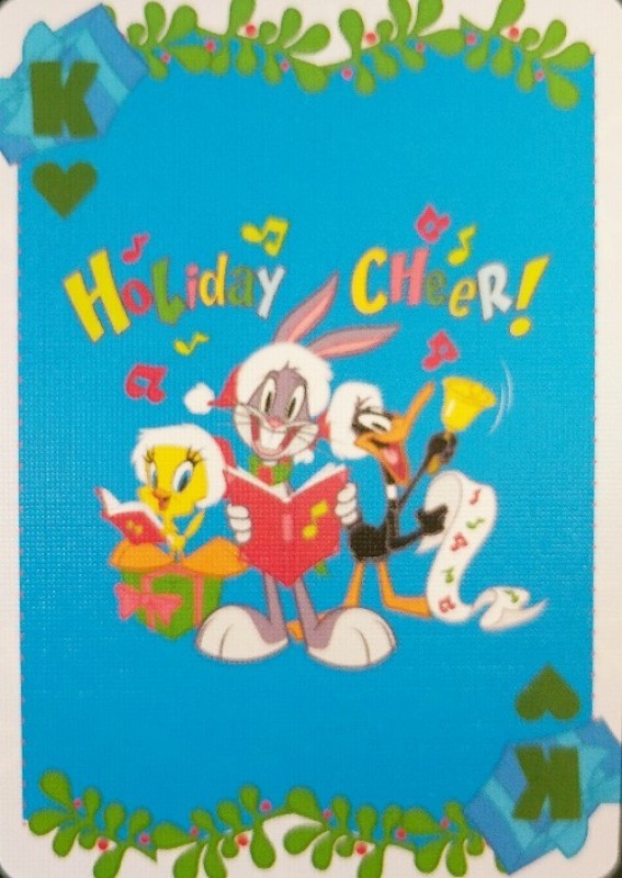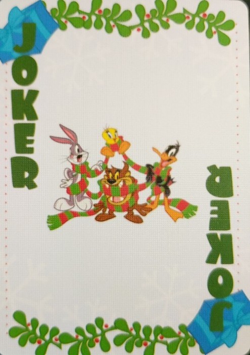 There are two Aquarius Looney Tunes holiday decks, a white one and this green one called "All Wrapped Up for the Holidays." Other than using the modern character designs for the classic characters (and coloring the clubs and spades red and the diamonds and hearts green), the two decks are different.