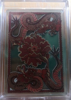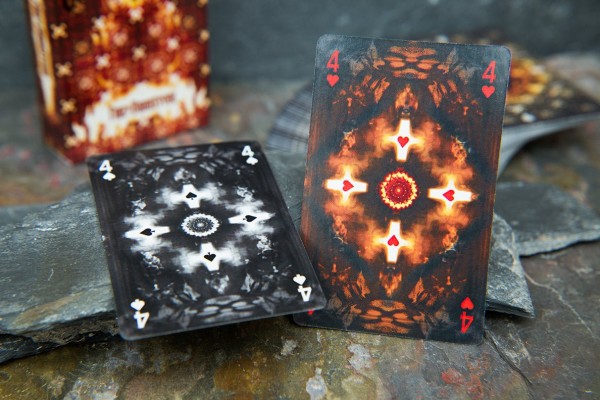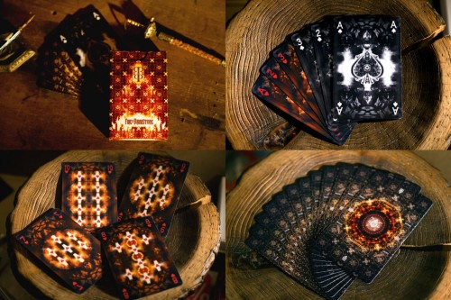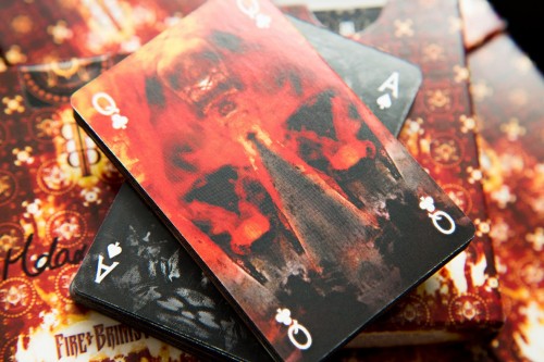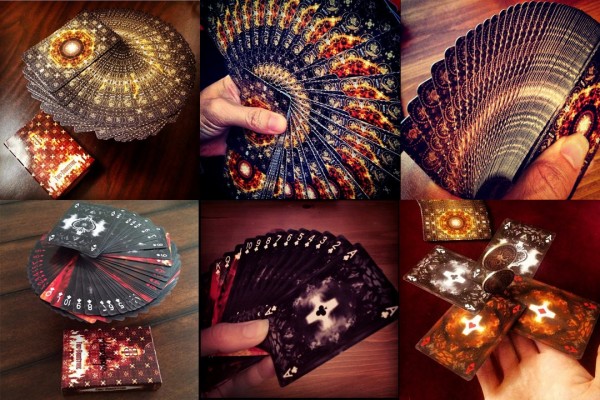 Cards designed by artist Molax Chopa. Custom bridge sized cards printed on casino stock with an ivory finish. Durable high gloss tuck with a hologram seal. Includes a separate deck seal, or sticker, with edition number written on the back of the sticker and signed. Released November 8th, 2013. Only 500 were made.
