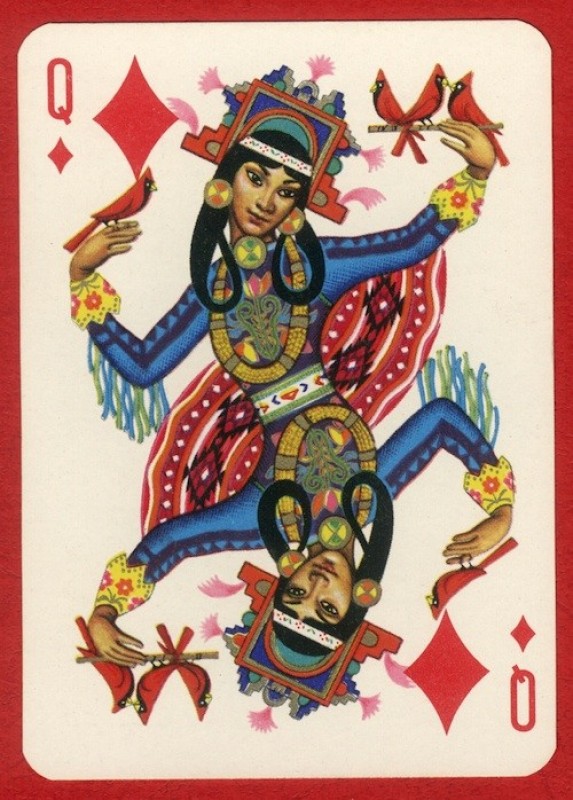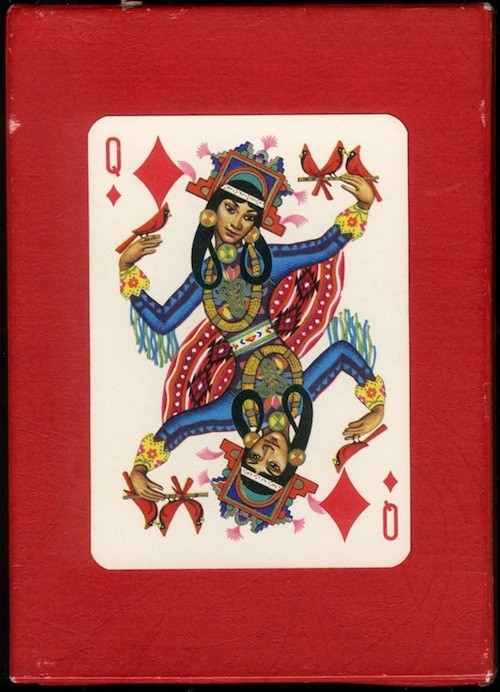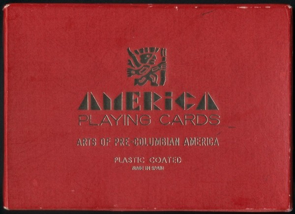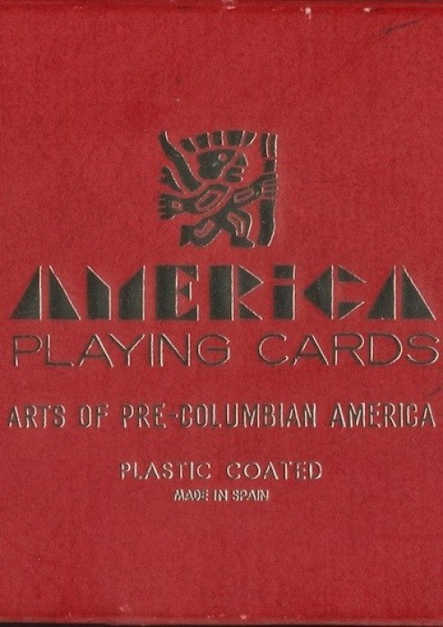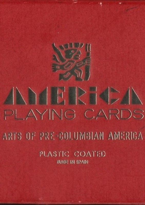 America: Arts of Pre-Columbian America 1960 52 cards and 2 jokers which show old maps. Two 32 page booklets, one in English and one in Spanish, in a small folder. Red clamshell box with deck insert. This is a high quality deck made by Fournier, with gilded corners, bright colours and gold ink. Designs and booklets by Teodoro N. Miciano (Professor of San Fernando High School of Fine Arts, Madrid). On the four suits, Native Americans from the North West, Eastern and plains, Aztecs and Incas, who lived in America before the arrival of Columbus. You can find this deck in the Fournier Museum Catalogue: vol. 1, page 93, #756 of Spain