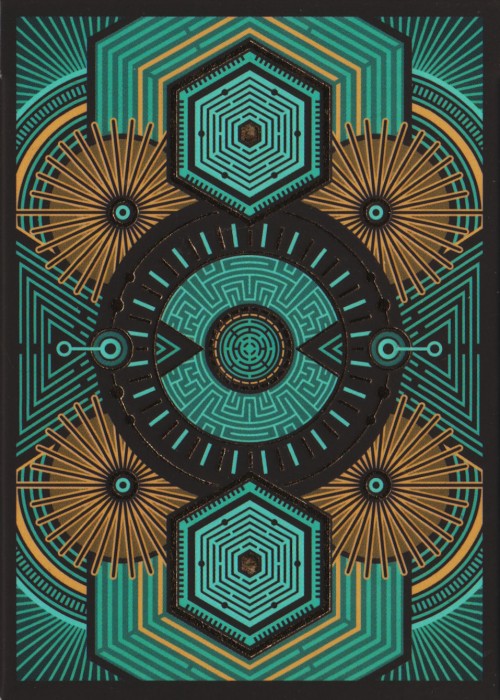 Fascinating colors, rarely found in nature. Turquoise symbolizing immortality and eternity, and the amethyst color that helps to keep a sober mind and control raging senses. Both are broken with royal gold and dark black, giving the decks a disturbingly fascinating character. What does it mean? The colors of the ocean depths, or maybe the depths of madness?
