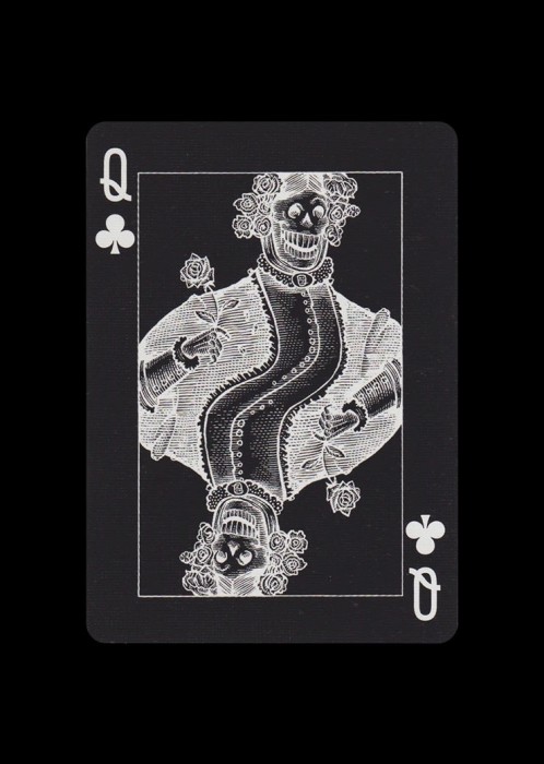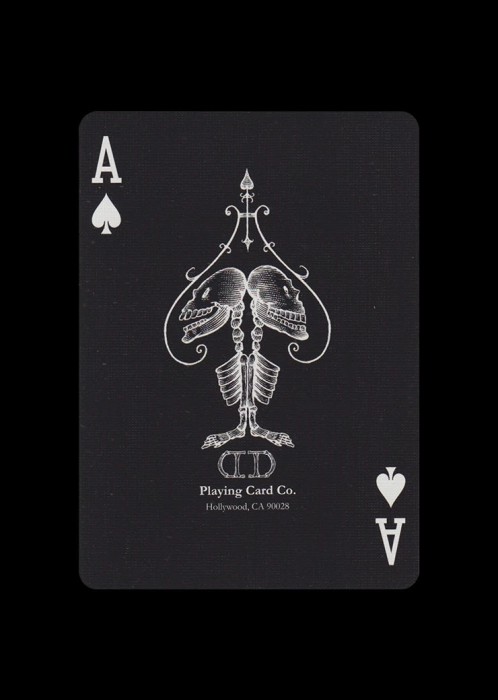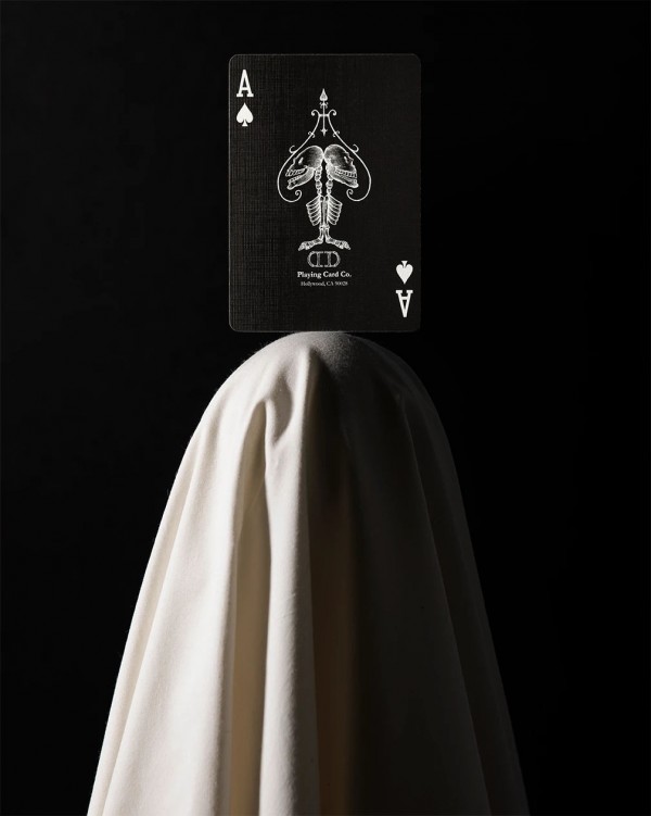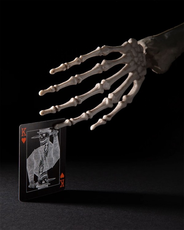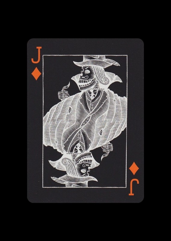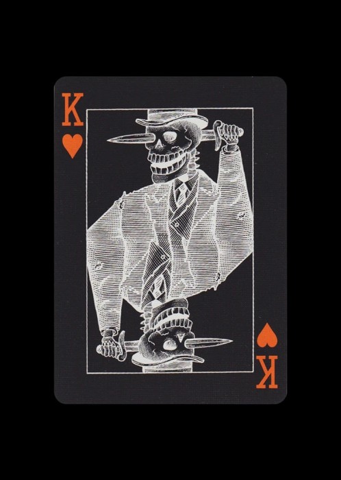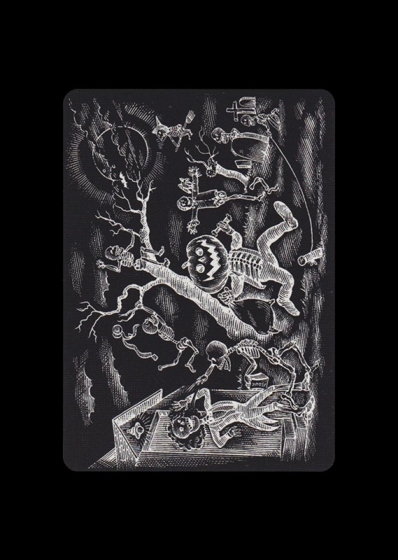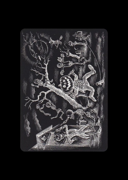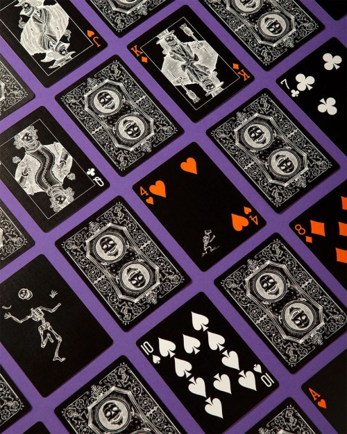 The cards feature a classic Halloween theme printed in the negative. The custom back design, ace of spaces, and face cards come packaged inside a gorgeous foil-stamped and embossed tuck box.