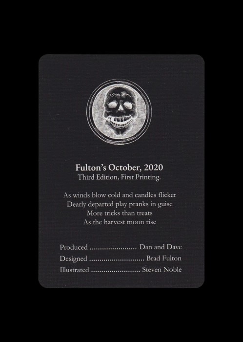 First released back in 2013 and then again in 2014. Fulton's October playing cards return in an all-new way. Designed by Brad Fulton with original illustrations by Steven Noble.