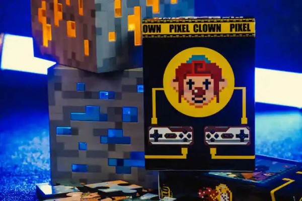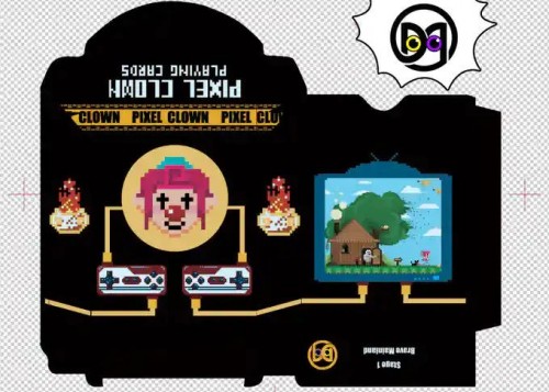 On the front of the card case you will see our protagonist pixel clown. We pay tribute to the FC game consoles of the 1980s, that was the golden age of pixel style. So you can see that there are two big game consoles connected. We hope to let you see the card box has a feeling that if you open the card box, just like playing a game you can enter the pixel kingdom with the pixel clown.