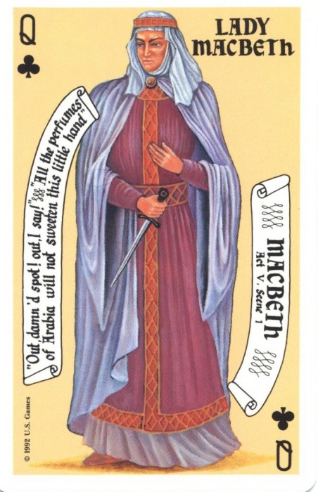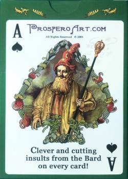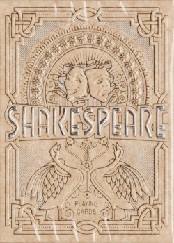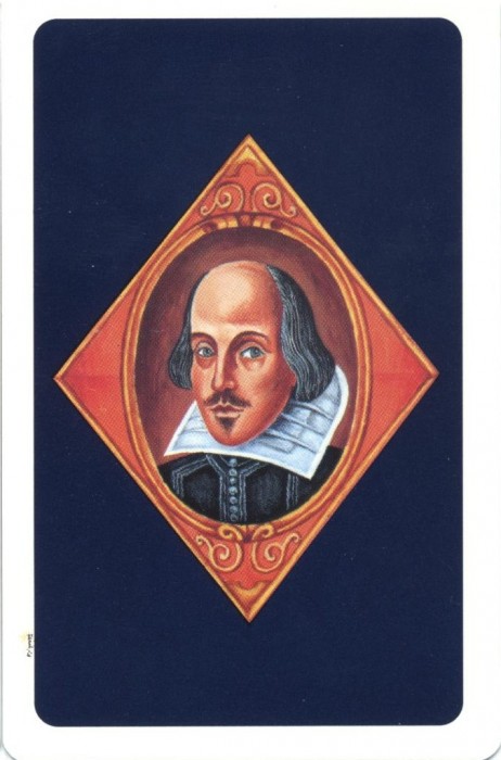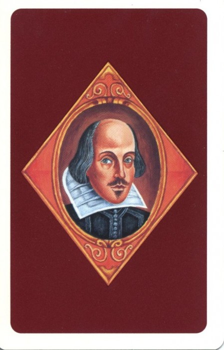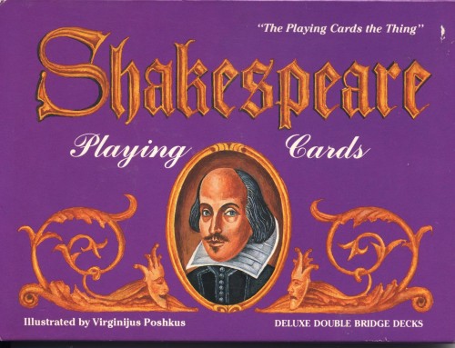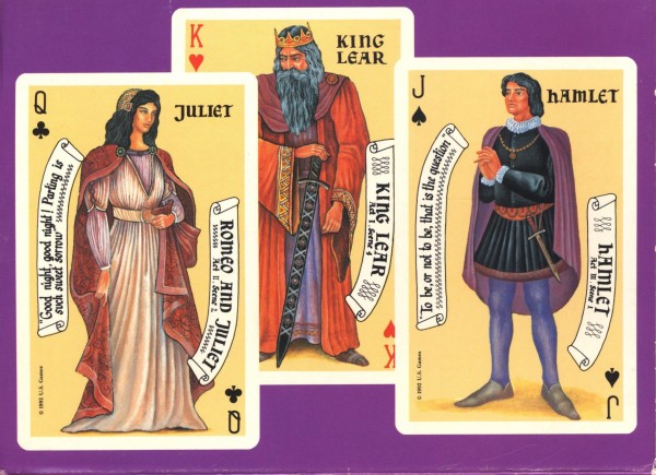 A double bridge deck, 1992, published and distributed by US Games Systems, printed in Belgium by Carta Mundi. Shakespeare on card backs, characters from his plays on court cards and jokers, along with quotations. Different set of court card characters in each deck, although the jokers are the same. Curiously, Romeo and Juliet are in separate decks.