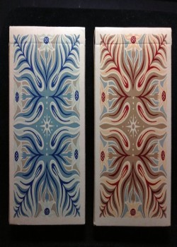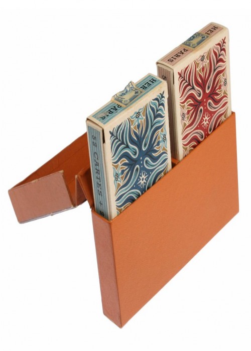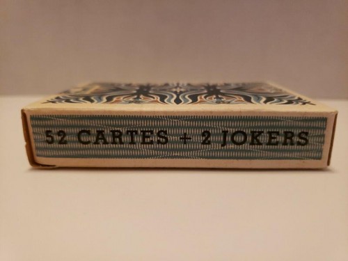 The second edition of this two-deck set was released around 1950. It includes two jokers plus the title card. The individual boxes are labeled "52 cartes + 2 jokers". Suit symbols on the court cards are cut off because the font used for the indices is larger. In addition, the design of the Jack of Diamonds differs from the first edition.