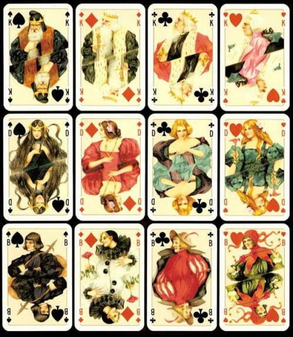 The cards are printed on a 300gsm German paper, with an air-cushion finish that handles extremely well. The cards are fully custom, with hand drawn details, rich court art and unique pips.