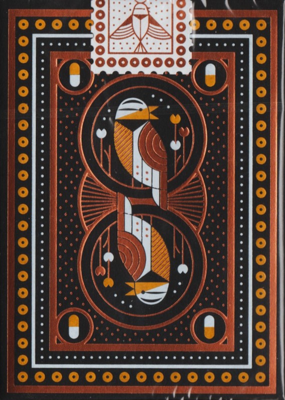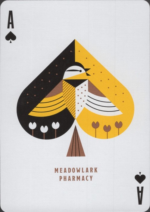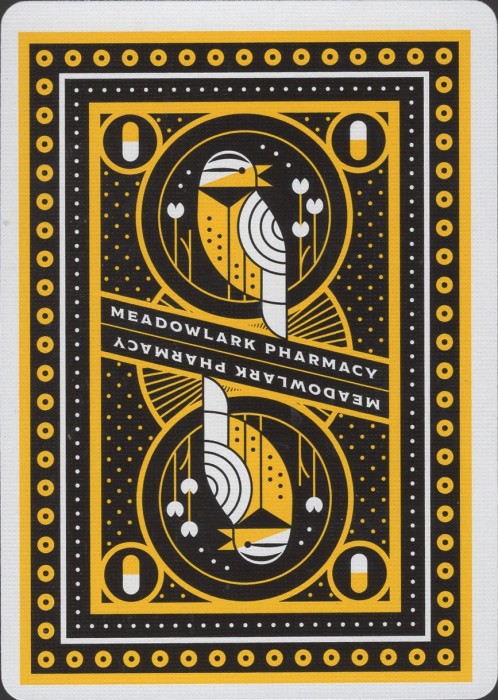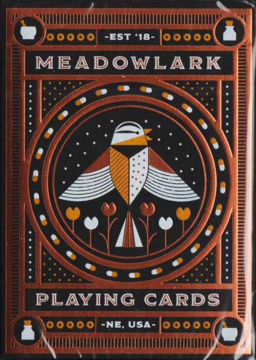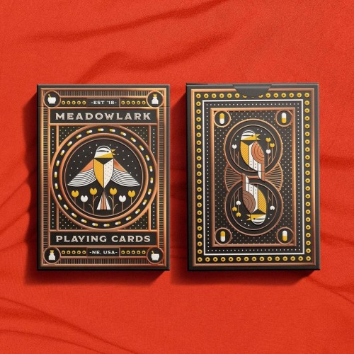 Custom playing cards created for Meadowlark Pharmacy in Lincoln, Nebraska. Featuring original artwork by Russell Gray. Packaged inside a premium foil-printed tuck box. Sustainably-produced using FSC certified paper and vegetable-based inks on our trademark thin-stock and finish. Printed by the United States Playing Card Co. QUICK OVERVIEW: Copper foil on a black paper stock with the yellow and white as the accent colors. Inside will be a yellow gilded deck! We are doing our best to match the yellow from the deck with the gilding, so it might be more of a yellow gold to make sure that it is shiny. However in the end the gilding has ended up being copper like the tuckKickStarter: https://www.kickstarter.com/projects/meadowlark/meadowlark-playing-cards