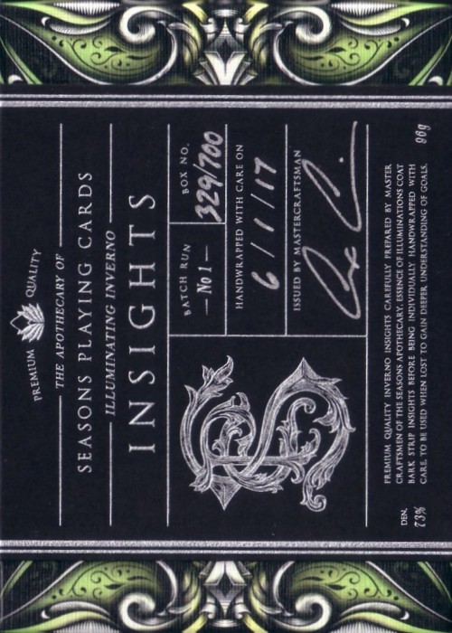 The Inverno Deck represents Winter in the beautiful 4-deck Seasons series. The back displays sleek illustrations of mesmerizing winds in a metallic blue accent. The winter collection displays class with silver foiling and embossing throughout the tuck box. The cards are produced by The United States Playing Card Company to ensure the quality and craftsmanship that playing card collector's have come to expect.