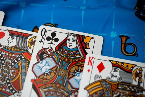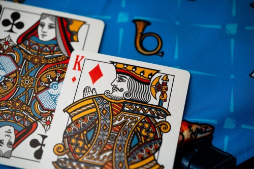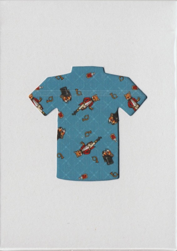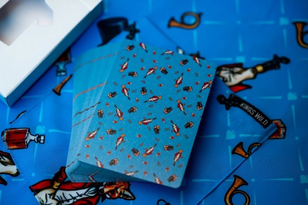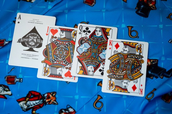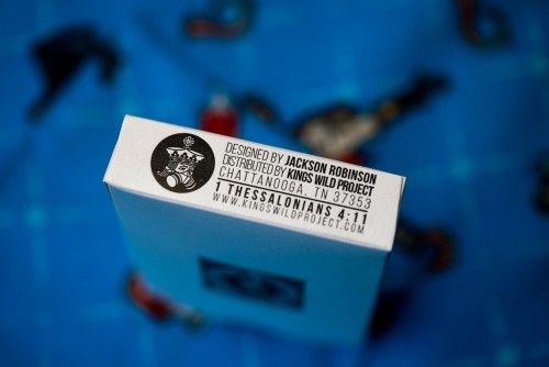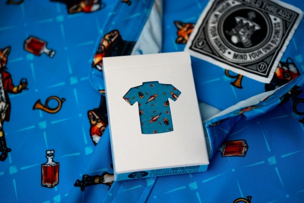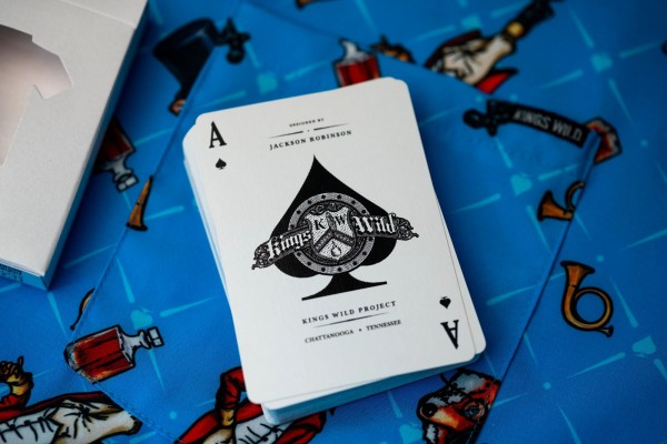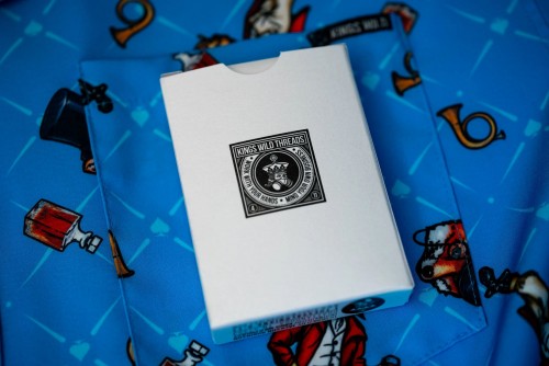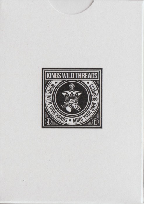 The Kings Wild Threads Deck No. 3 is the third deck in a line of custom playing cards made to pair with the Kings Wild Threads Shirt line. These limited print decks feature a matching Tally Ho Fox Joker pattern on the back design which can be viewed through the custom shirt shaped die cut hole on the tuck case. Designer Jackson Robinson used his own standard court and pip designs on this simple yet unique deck of playing cards.