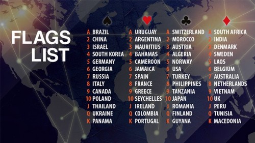 This deck is crafted for magic by French magician Yoan Tanuji for Magic Dream, magic store in France. The card backs have a total of 52 flags from 52 different countries with the overlay design of Maiden Back. There are two extra aces for a four-aces magic routine, a double backer of USA flag, and a card bearing the list of countries of the flag used in the deck - link to the instruction video of magic tutorial using the deck.