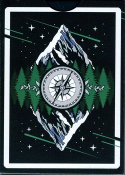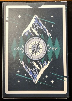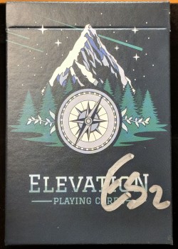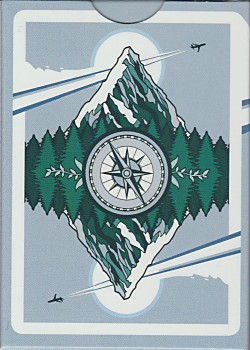 Elevation: Day Edition playing. The courts are recolored to a gentle baby blue and all the courts are holding something related to the theme (a compass, hiking stick, etc…) The two-way back design features a broken border that helps create amazing fans. The deck contains three jokers, a duplicate card and a custom ace of spades.