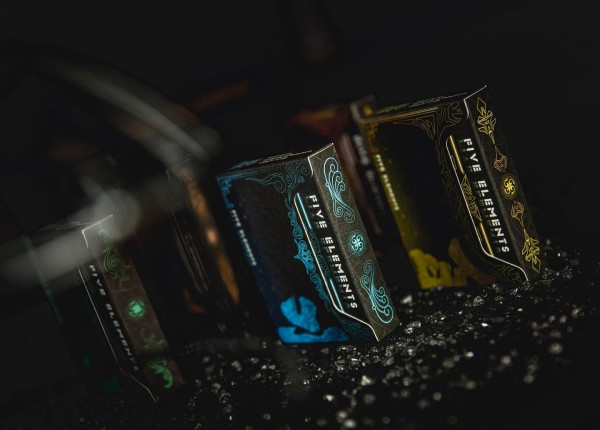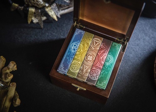 The full set consists of 5 decks of cards. 5 distinct designs correspond to 5 elements, which are represented as a totem on the back of the card and the card box.