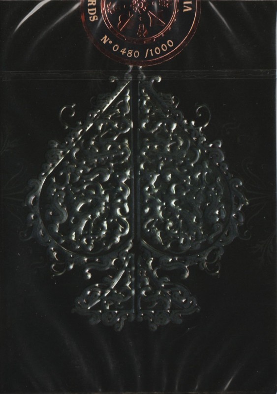 The Victorian playing cards Obsidian deck is composed of fifty two cards and two jokers. The project main idea is to replace the traditional court cards by symbols: scepter for the king, rose for the queen and pistol for the jack. Other cards stays as usual. The colors are copper for the red and silver for the blacks. The background is black with a victorian pattern. The cards are mirrored so they look the same upside down with subtile differences.