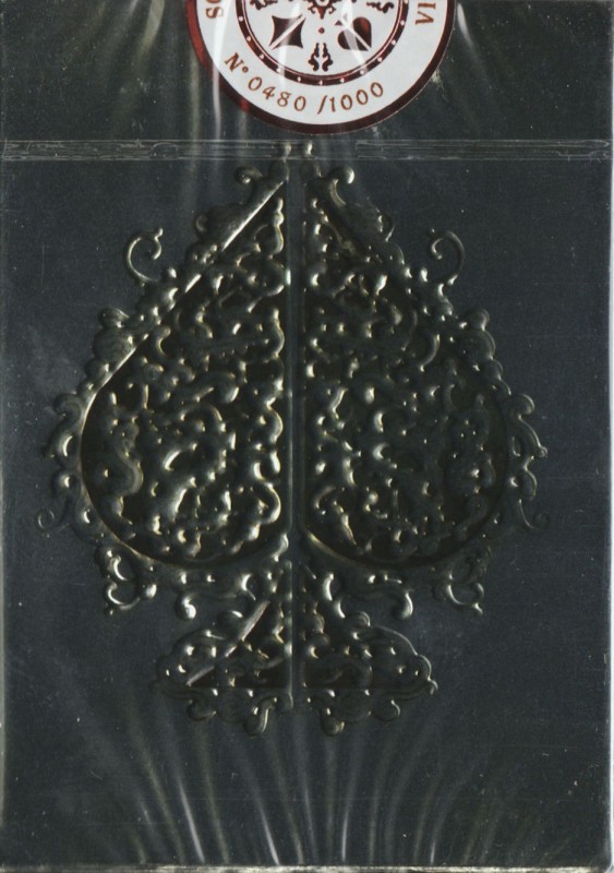 The Victorian playing cards Obsidian deck is composed of fifty two cards and two jokers. The project main idea is to replace the traditional court cards by symbols: scepter for the king, rose for the queen and pistol for the jack. Other cards stays as usual. The colors are copper for the red and silver for the blacks. The background is black with a victorian pattern. The cards are mirrored so they look the same upside down with subtile differences.