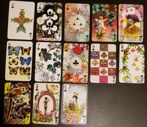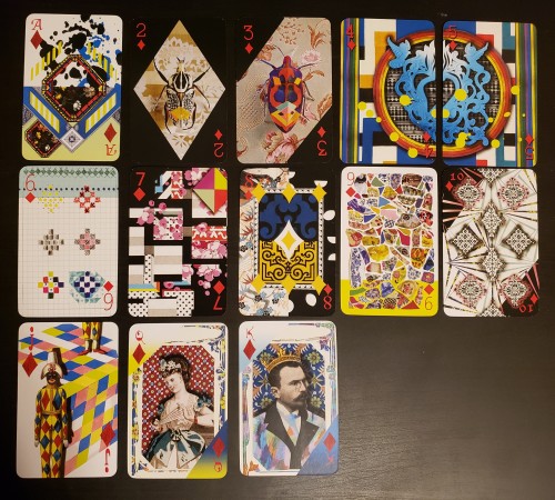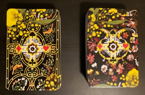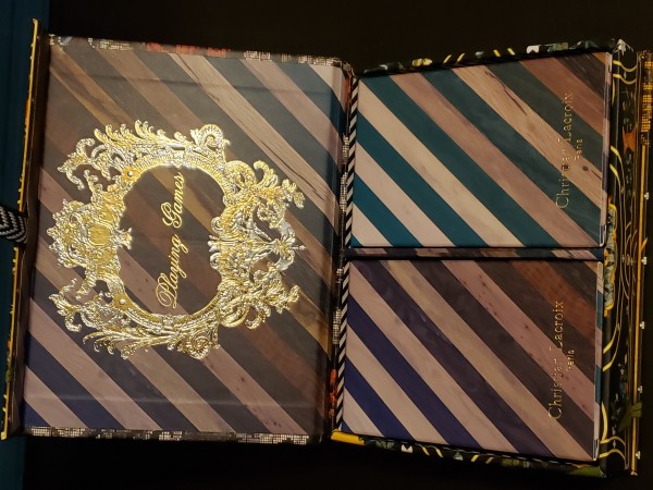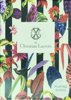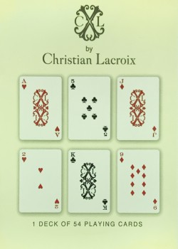 The Christian Lacroix Maison De Jeu playing cards set features art depicting the atmosphere of vintage French gambling houses. The cards are as much a work of art to be admired as they are functional. Each playing card has its own unique design from the world of Christian Lacroix, and each deck has its own keepsake box. You will see something new each time you look at these cards. The playing card set includes two decks of 52 cards plus two jokers packaged in a decorative keepsake box with a chevron ribbon pull tab. The outer box measures 4.25” x 6” and the deck box measures 2.5” x 4”.