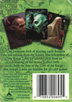 LORD OF THE RINGS DECK OF PLAYING CARDS: The armies of Mordor are gathering, and it’s up to the heroes of the free races to rally together in defense of Middle-earth! Fight it out in an epic battle with this LOTR themed deck of playing cards
