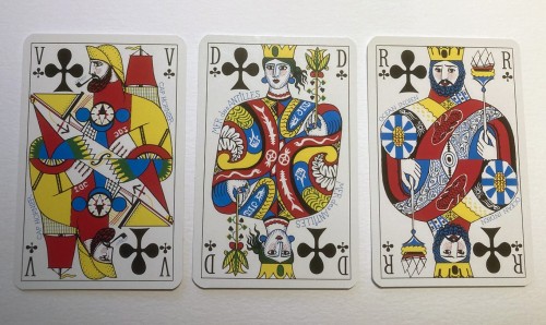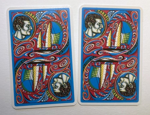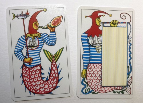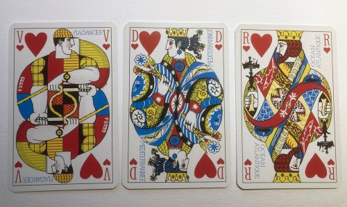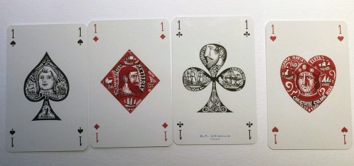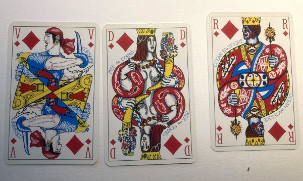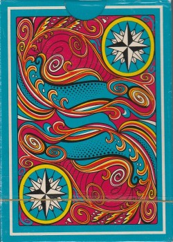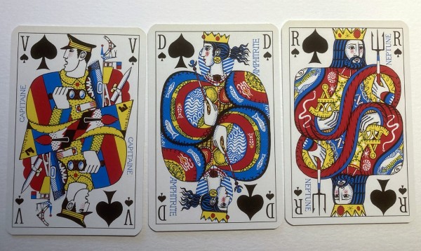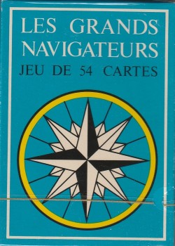 Printed by Grimaud c.1976, "Les Grands Navigateurs. The cards feature wonderful original designs on the backs, Jokers, Aces and court cards by artist Jean Delpech that depict famous figures concerned with navigation, both real (Columbus, Magellan, Drake, etc.), and mythological (Neptune, Amphitrite), and famous places (Cape Horn, Indian Ocean). Included is a folded insert describing the persons and places shown.