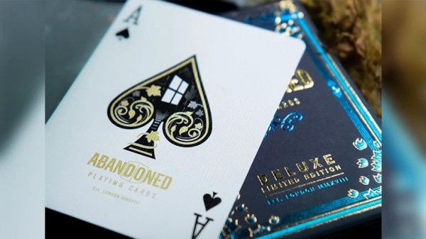 Printed on Cartamundi True Linen B9 Slimline the deck is as beautiful to look at as it is to hold. The backs of the Limited Edition Abandoned Deluxe decks highlight the wrought iron gates intertwined with blue ivy and gold foil.