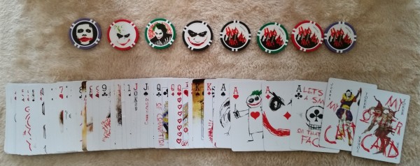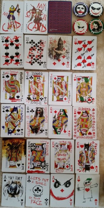 While another Limited Edition version numbered to 3,000 was also available, this entry is for the more common set created for DC Direct and FYE stores. It includes 20 11.5 oz clay poker chips (5 of each color) and the deck itself which is a standard deck made to look like the Joker defaced them. It was created to promote and be a fan deck for the movie The Dark Knight.