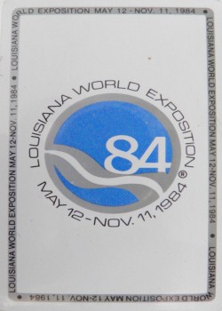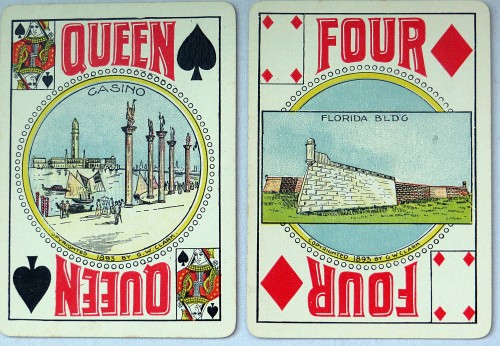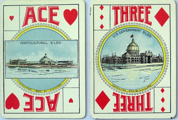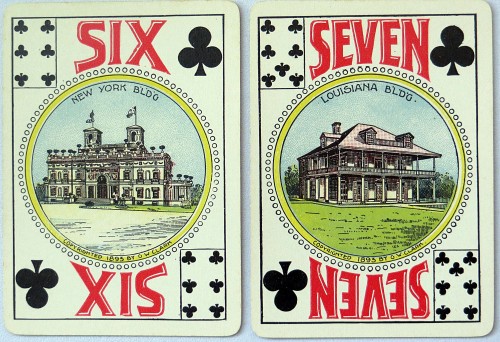 From The World of Playing Cards "The reverse depicts the Landing of Columbus in an ornamental frame, whilst all the face cards feature coloured sketches of the fair with miniature playing cards (triplicates) in the upper-left and lower-right corners serving as indices, with the value of the card shown at the top and bottom."