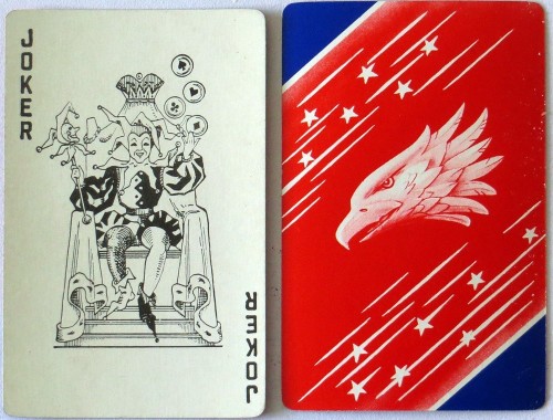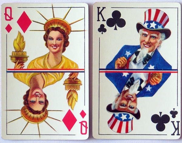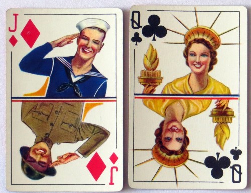 From the World of Paying Cards: "Victory" cards issued by ARRCO Playing Card Co soon after VE day celebrating the U.S. participation in the Allied victory, c.1945. The court cards are Uncle Sam, Lady Liberty repeated in each suit, with the jacks being different at each end, either a saluting soldier or sailor.