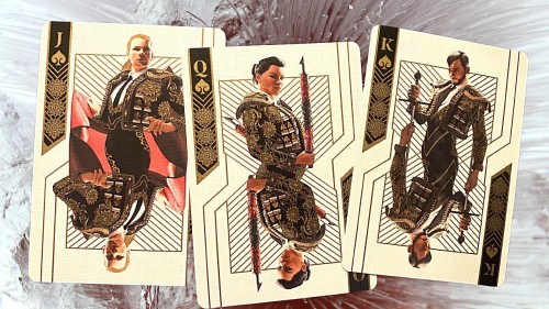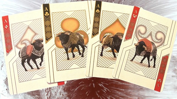 Live the essence of the great bullfights through these decks inspired by the popular festival born in Spain. The big bulls in the aces jump into the ring and fight for their survival against the brave toreadors armed with capes, spears and swords on the court cards or the picadors in the jokers. Metallic gold and silver inks help show off the majestic costumes and intricate design elements.