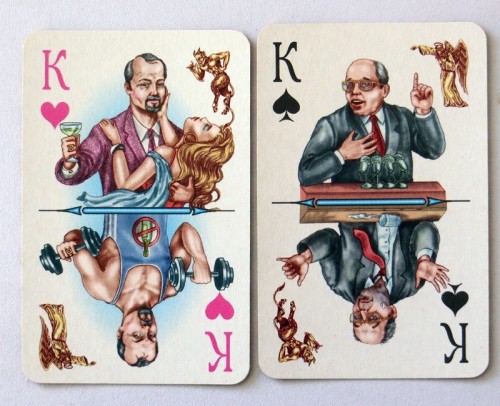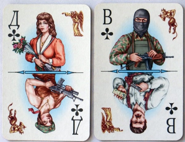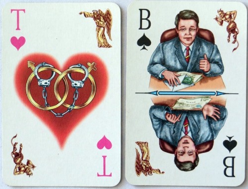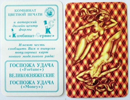 RUSSIAN "DAME FORTUNE" or "MRS LUCK" - playing cards 1998 - Published in 1998 By "The Colour Printing Plant" (Russia) for "Combinat-service" Printed on "not the best quality" card. Cards are fairly rough to the touch. There are 52 cards, plus 3 jokers and an advertising card. The 4 suits are themed along the lines of love, religion, power and money.