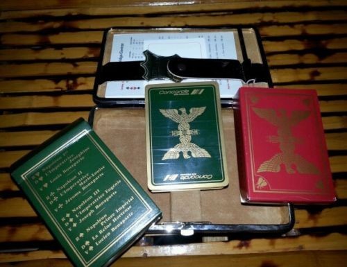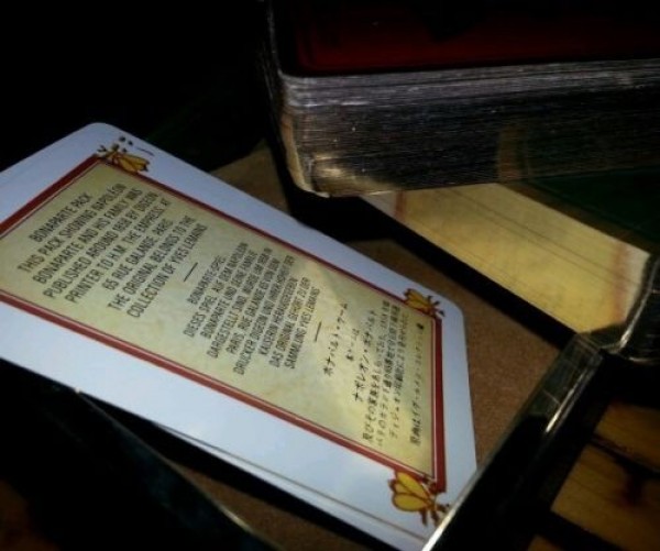 Deck made around 1982 which is a copy of a set originally printed in 1858 in Paris. The court cards represent Napoleon and his family. A standard 52 cards and 2 jokers. The text on the jokers reads: National fund for historical monuments and sites. Rough translation follows of text around Royals and Aces: