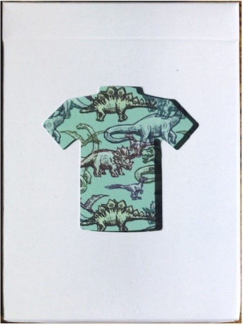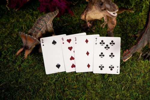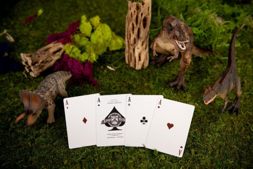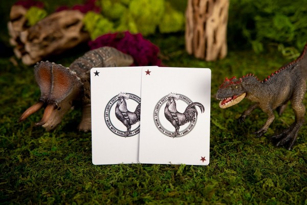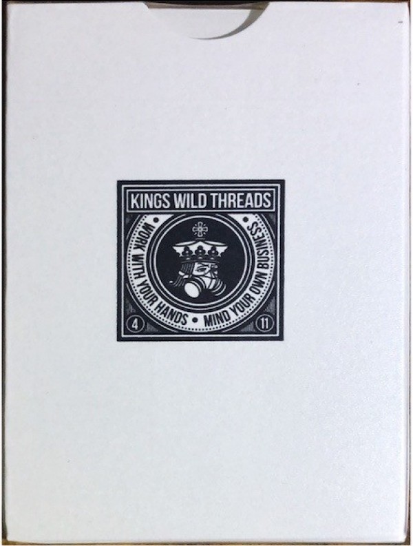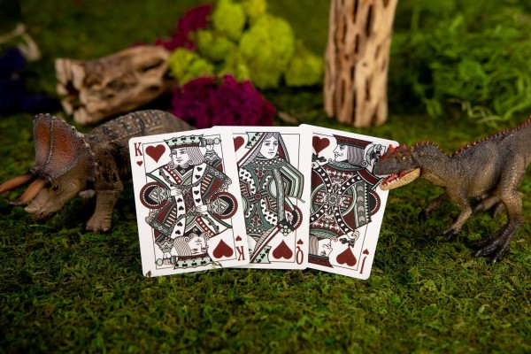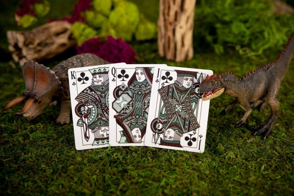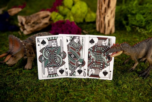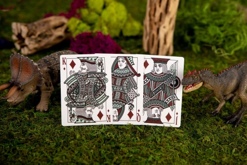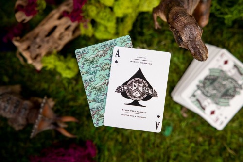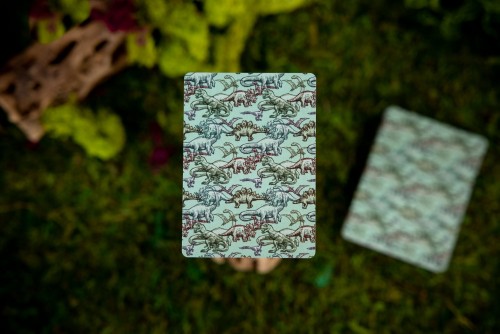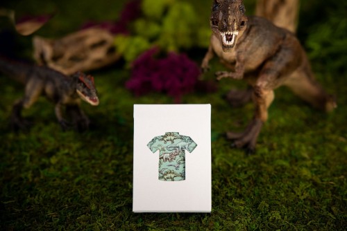 The Kings Wild Threads Dino Deck is the sixth deck in a line of custom playing cards made to pair with the Kings Wild Threads Shirt line. These limited print decks feature a matching dino pattern on the back design which can be viewed through the custom shirt-shaped die-cut hole on the tuck case. Designer Jackson Robinson used his own standard court and pip designs on this simple yet unique deck of playing cards.