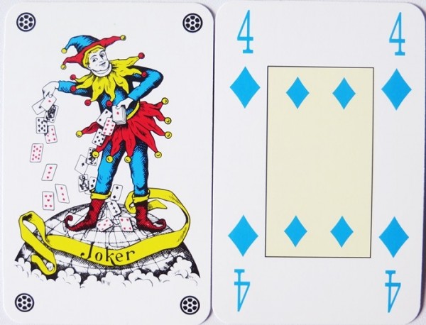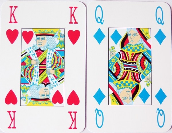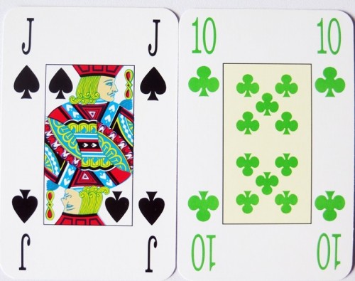 Large Index cards. Colours of suits: Heats Red, Spades Black, Diamonds Blue, Clubs Green.
