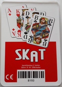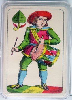 Standard German Saxon Pattern, with Germanic suits (leaves, acorns, hearts and bells) and German Indeces (D K O U). The cards are double headed, and this pack probably dates to the early 20th century.